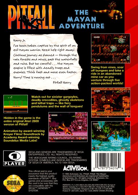 Pitfall: The Mayan Adventure is a side-scrolling action game in which you play adventurer Pitfall Harry Jr in search of his father Pitfall Harry. You battle your way through the Mayan jungles, waterfalls, deserted mines and can bungee jump and boomerang your way to safety. There are 13 levels and the action is fast and gripping. You will need to be attentive—and quick. Or prepare to die.