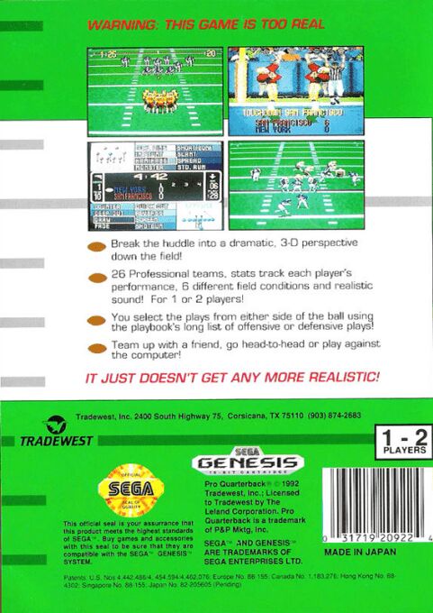 Pro Quarterback is a football game featuring 27 different teams. Since this game doesn't have an NFL or NFLPA license, there aren't any real NFL teams or players here, although the teams included in the game represent the cities of their real life NFL counterparts and also mimic the colors of their team's uniforms.