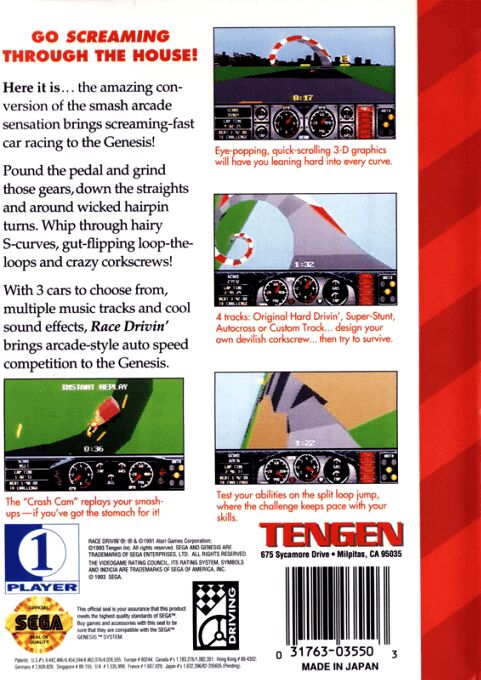 Race Drivin' has three courses, one of which is the track from Hard Drivin'. There is a new super-stunt track, and an autocross course. The player also may choose from three types of cars.