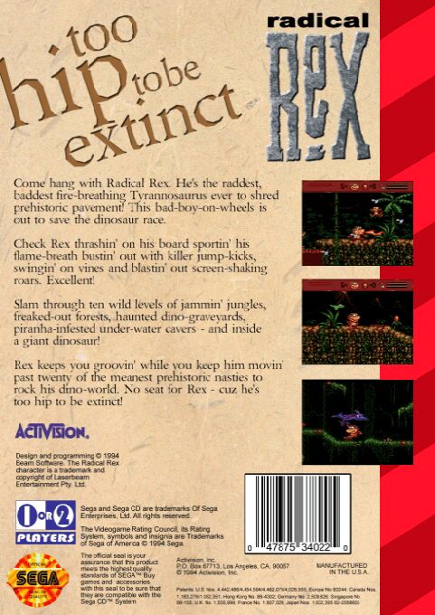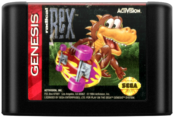 Radical Rex is a fire-breathing Tyrannosaurus on a skateboard who has to save the dinosaur race under the spell of an evil creature. The game consists of 10 levels set in the prehistoric age. Radical Rex can use a skateboard or glide down hills, jump, kick and breath fire. Tougher enemies need multiple hits and when burnt Rex needs to kick them once more to destroy them or use his scream (hits everything on the screen). While playing Rex collects eggs, health, power-ups for his fire breath and scream refills. Checkpoints are shown as torches that need to be charged with fire. After each level, there is a Bomberman-like sequence to earn an extra continue. Enemies include flies, turtles, toads and all kinds of dinosaurs.