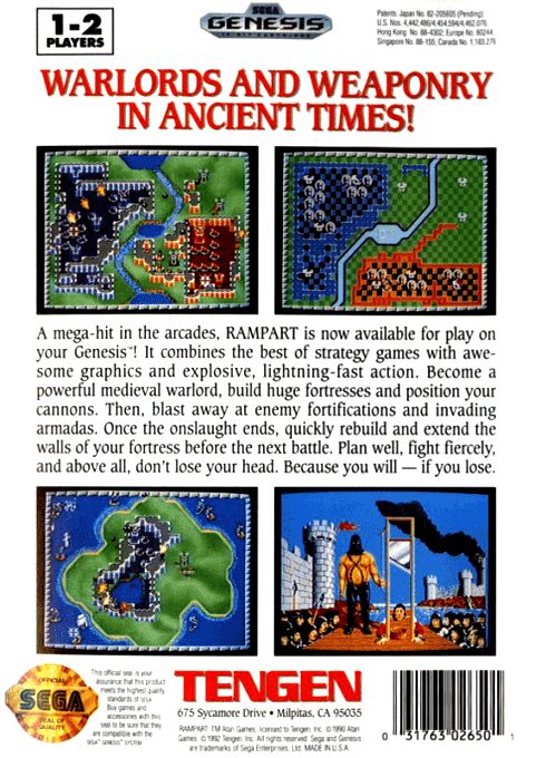 Tetris meets shoot-'em-up, Rampart is a game combining strategy and artillery action. Build your castle from Tetris-style pieces, place your cannons, bombard the enemy, try to repair, do it all over again. The original arcade release has a single-player and a two-player mode; later revisions incorporate three-player gameplay.
