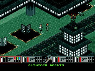 Taking the role of an executive of a criminal syndicate in a dark cyberpunk future, the player controls teams of cyborg agents on missions: assassinating politicians, opinion leaders or executives from rival syndicates, retrieving important objects, kidnapping scientists or taking out enemy agents. The world map consists of 50 regions, each containing one level (two training levels are also available). The stages are presented in isometric view, and one to four agents are controlled. Unlike the indirect cursor control in the computer versions, on the consoles the agents are controlled directly, with potential targets being selected automatically. Unlike the multi-layered versions of the computer game, all levels consist of one layer only.