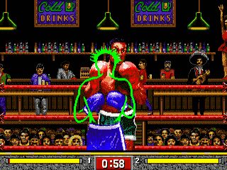 The boxing action is viewed from behind the back of the fighter you control. Your fighter is rendered as an outline, so you can see what your opponent is up to and react accordingly. Toughman matches consist of three one minute rounds. Your goal is to KO your opponent by causing their stamina meter to decrease to the point where they fall down, or beating on them enough that you are scored the winner at end of the third round.